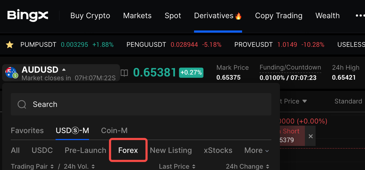 انتقل إلى العقود الآجلة الدائمة على BingX واختر فئة TradFi التي ترغب في تداولها، مثل الفوركس أو السلع أو الأسهم أو المؤشرات. ثم اختر زوج تداول محددًا، مثل EUR/USD أو الذهب أو TSLA أو SP500، بناءً على السوق أو الأصل الذي ترغب في التعرض له.