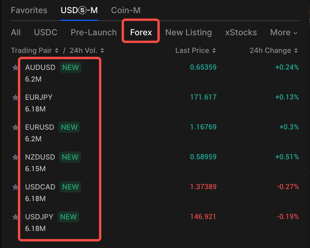 يمكنك تداول السوق المالي الأكثر سيولة في العالم باستخدام عقود الفوركس الآجلة الدائمة بهامش USDT، والتي تغطي أزواجًا رئيسية مثل EUR/USD، USD/JPY، GBP/USD، AUD/USD، و EUR/JPY. تدعم BingX رافعة مالية تصل إلى 500 ضعف على أزواج فوركس مختارة، مما يسمح لك بالتحكم في مراكز أكبر برأس مال صغير نسبيًا. يتم الحصول على الأسعار من مزودين مؤسسيين مثل IG و Bloomberg، ويتم تسوية معدلات التمويل كل 8 ساعات، على غرار العقود الدائمة للعملات المشفرة. وهذا يجعل عقود الفوركس الآجلة الدائمة مناسبة للاستراتيجيات المدفوعة بالاقتصاد الكلي، ورهانات أسعار الفائدة، وتداول التقلبات قصيرة الأجل حول إصدارات البيانات الاقتصادية.