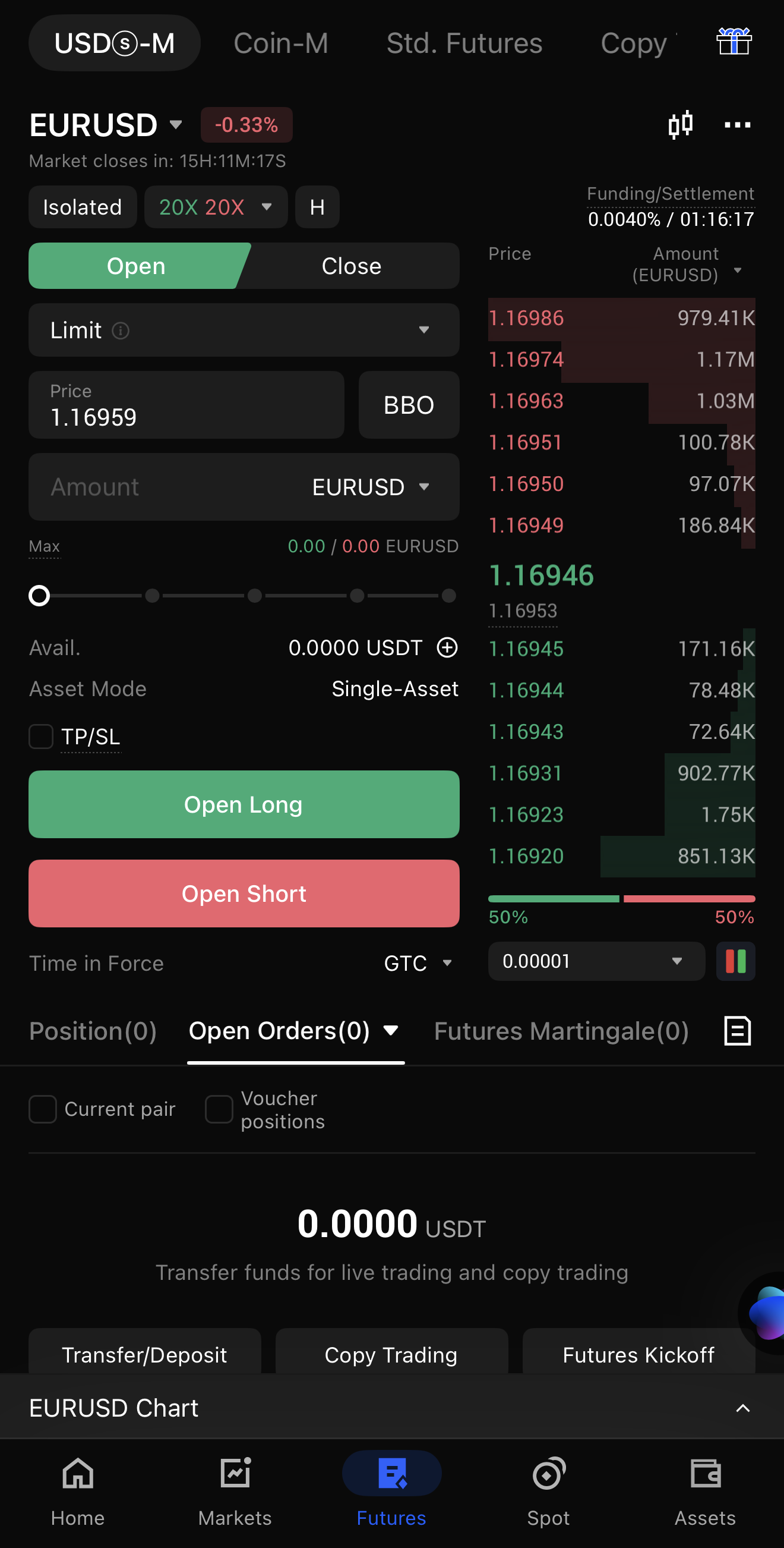 1. موّل حسابك بـ USDT: يمكنك إيداع USDT كضمان واختيار سوق مثل الفوركس أو السلع أو الأسهم أو المؤشرات.