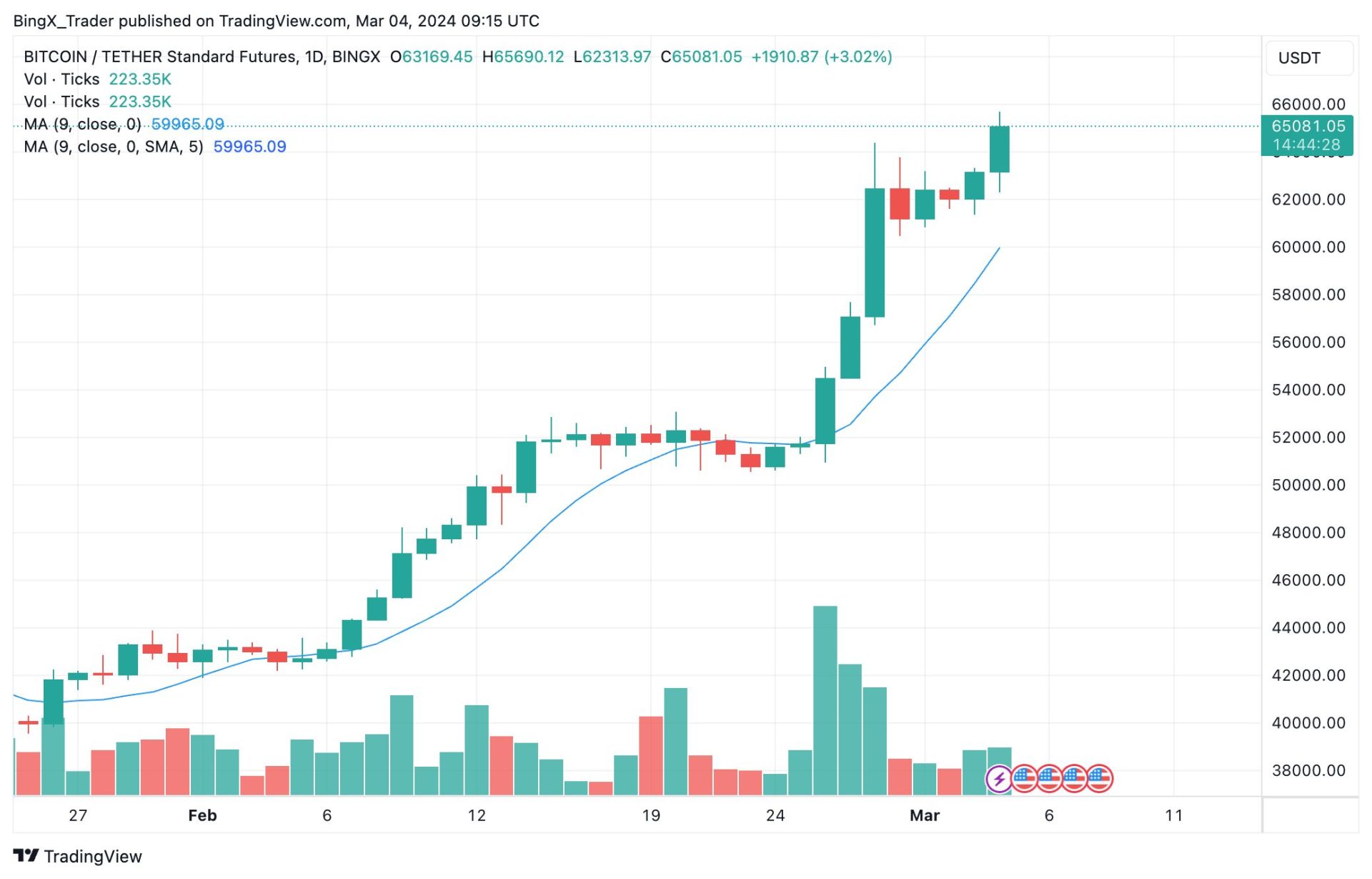 Thông tin này mang lại hai luồng ý kiến khác nhau. Một số cho rằng dòng vốn này có thể không bền vững do nhu cầu chậm lại khi giá Bitcoin tăng hoặc do hạn chế khả năng chịu rủi ro của các nhà đầu tư đối với tiền điện tử. Ngược lại, một số nhà giao dịch tin rằng tăng giá Bitcoin có thể tạo ra “hiệu ứng quả cầu tuyết”, “làm tăng doanh số bán ETF” – theo quan điểm của các nhà phân tích JP Morgan. Vùng hỗ trợ là 59.500 USD và kháng cự là 66.500 USD.
