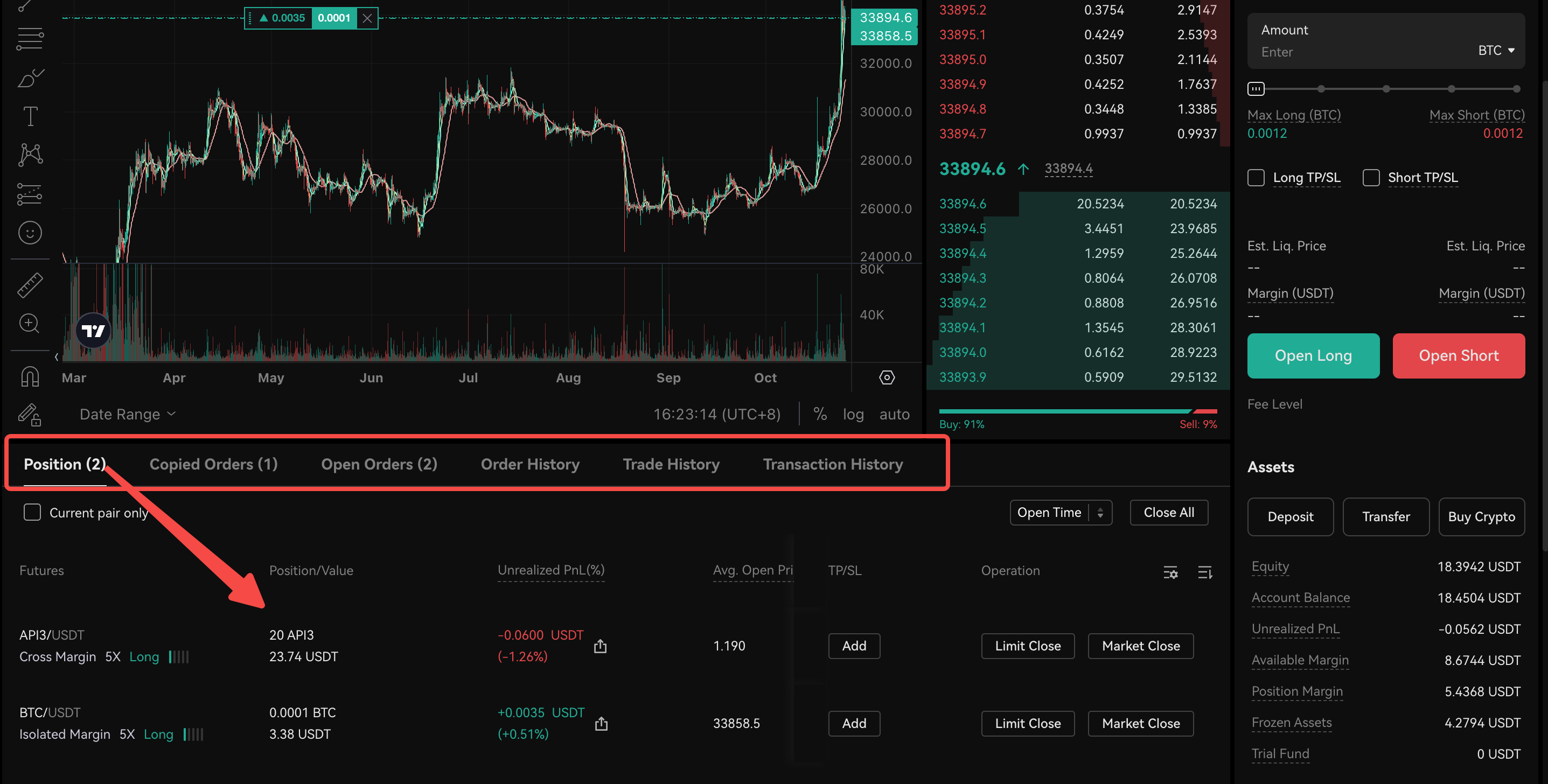 Details der ausgeführten Order, wie z.B. durchschnittlicher Positionspreis, Positionsgröße und nicht realisierte PnL können unter Position eingesehen werden; Ausstehende Order können unter "Offene Order" eingesehen werden.