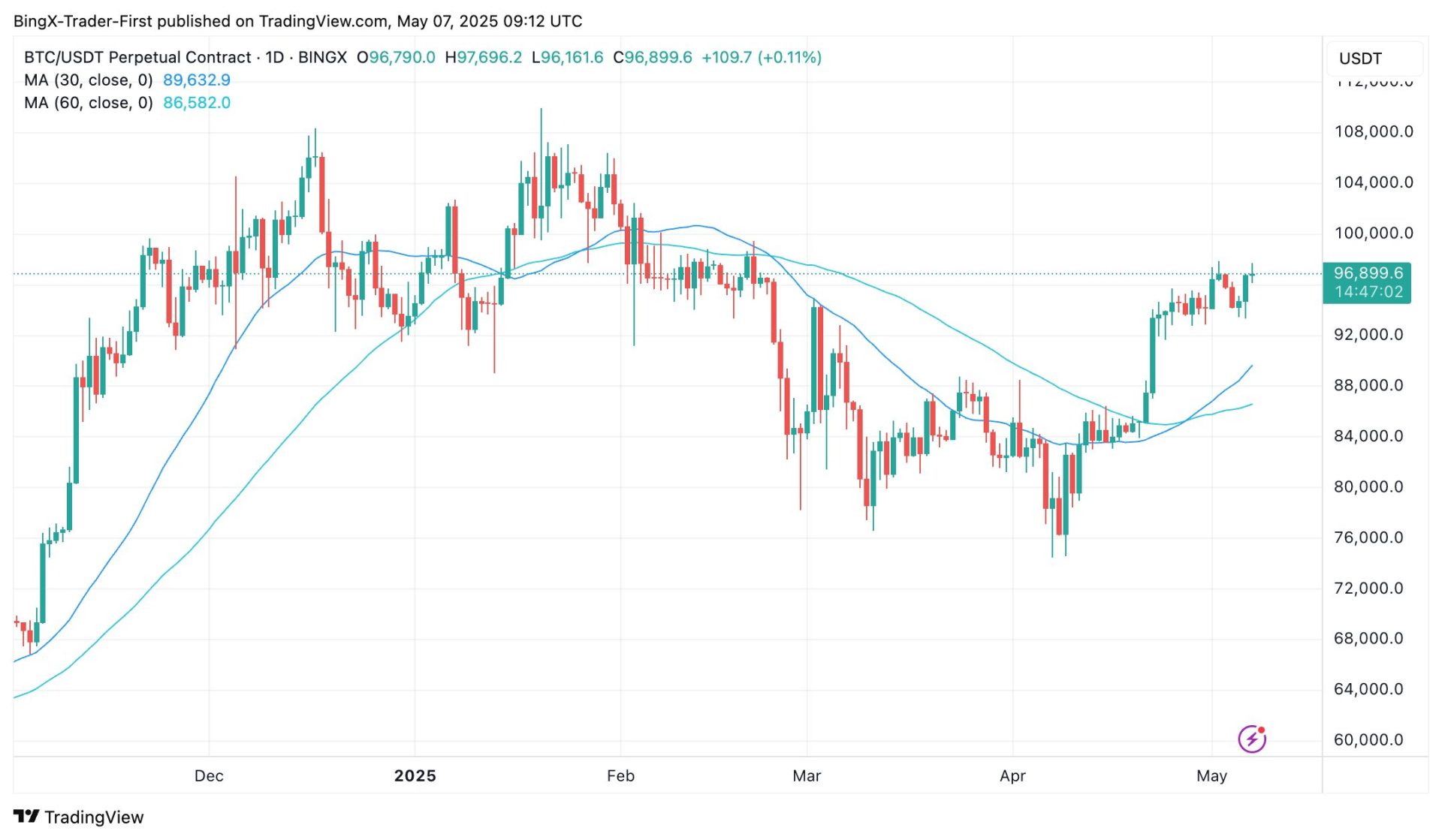 The 4-hour chart for BTC/USD shows Bitcoin trading at $96,899 as of May 7, 2025, marking an increase of 0.11% from recent levels. The price has surged from a low of $93,770 earlier in the period, breaking above the resistance near $95,000 and approaching the previous high of $97,956. The 30-period moving average at $89,632.9 and the 60-period moving average at $86,582.0 are well below the current price, supporting the short-term bullish momentum. The candlestick patterns indicate strong buying pressure, with a large bullish candle driving the recent breakout, though volume has slightly decreased, suggesting a potential slowdown in momentum. The RSI on the 4-hour chart is at 60.80, indicating a slightly overbought condition, while the MACD shows a bullish crossover, supporting the upward move.