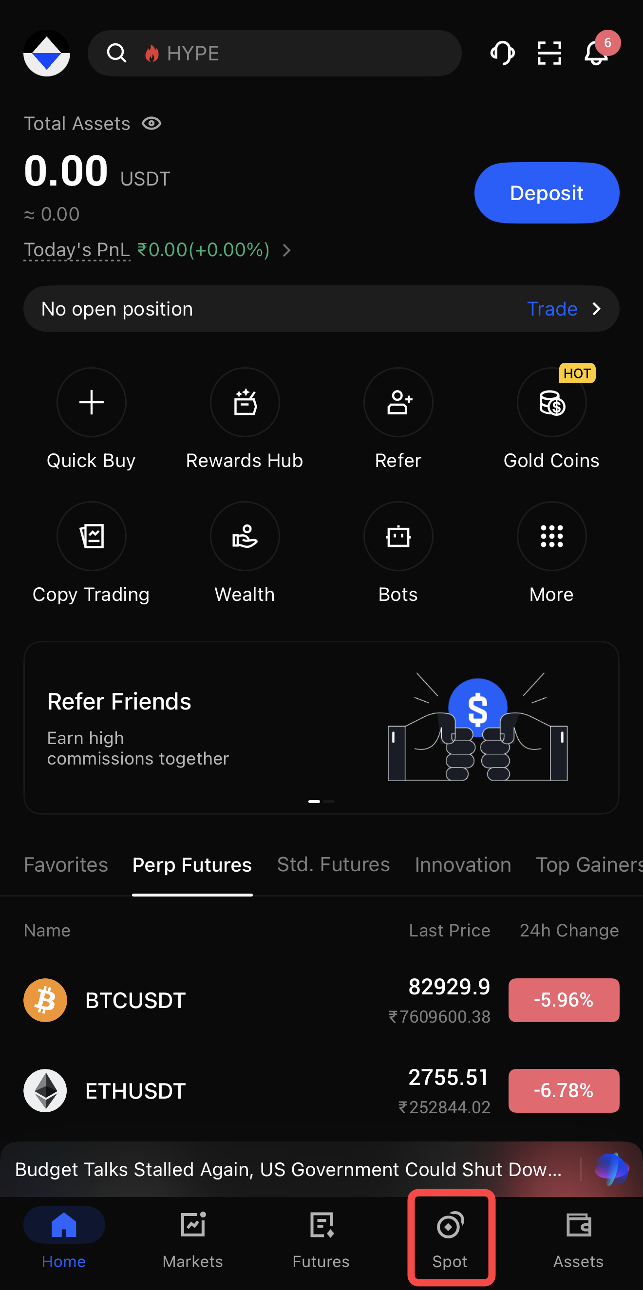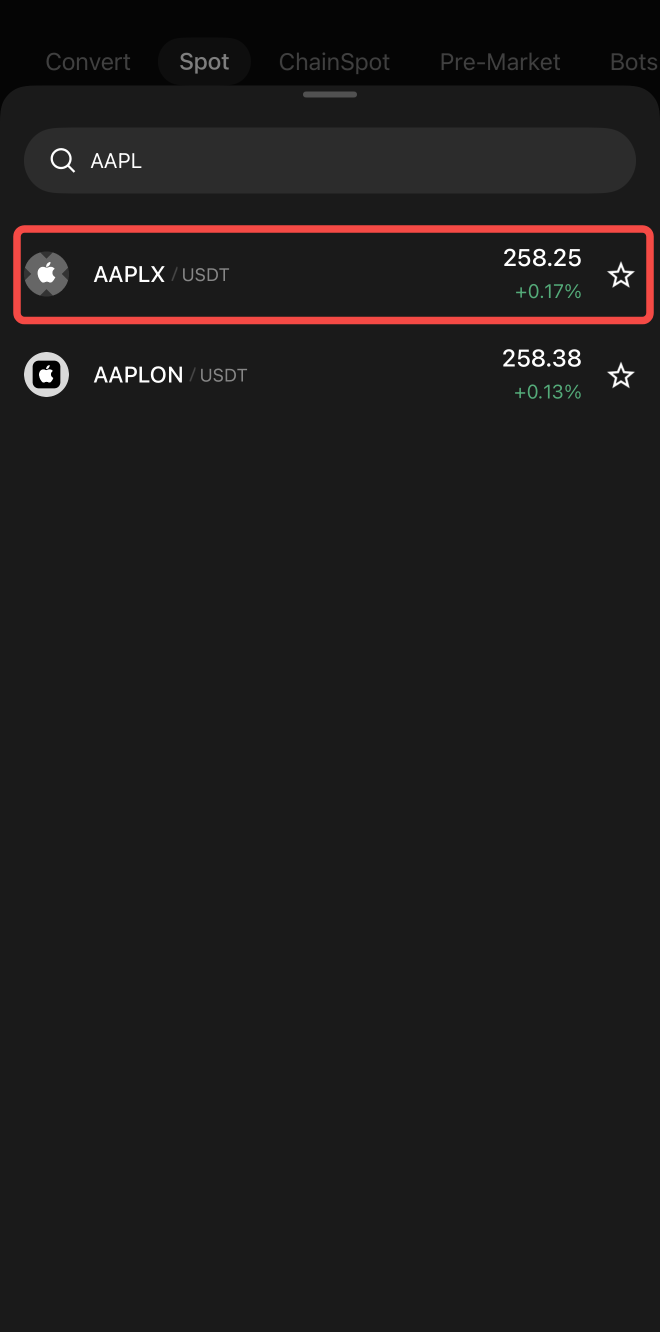 1. Tap “Spot:” Open the Spot market to access tokenized stocks such as AAPLx, NVDAX, or SPYon.