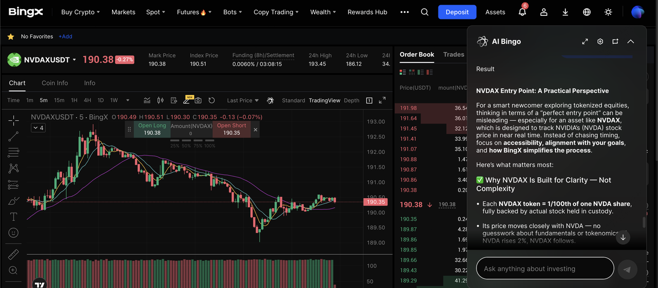 To assist decision-making, BingX AI Insights delivers real-time market analysis, trend signals, and volatility indicators, helping users navigate both spot and futures tokenized-stock markets with greater confidence.