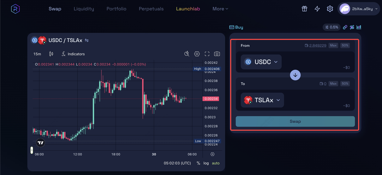 4. Swap stablecoins for tokenized stocks: Choose the relevant trading pair, for example, TSLAX/USDC or AAPLx/USDC, review liquidity and price impact, set slippage tolerance, and confirm the swap on-chain.
