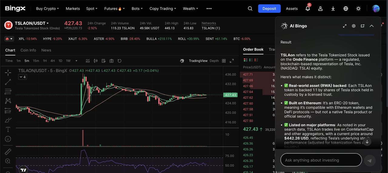 For beginners, BingX offers a practical and lower-friction entry point, with a curated lineup of spot tokenized stocks (xStocks), institutional liquidity, crypto-based funding, fractional trading starting from small amounts, and a familiar spot-trading interface supported by BingX AI insights. As you gain experience, on-chain trading via DEXs and Web3 wallets can unlock deeper DeFi integration and self-custody, though with higher technical and security responsibilities.