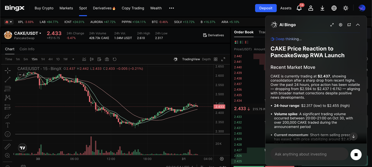 CAKE/USDT trading pair on the spot market powered by BingX AI insights