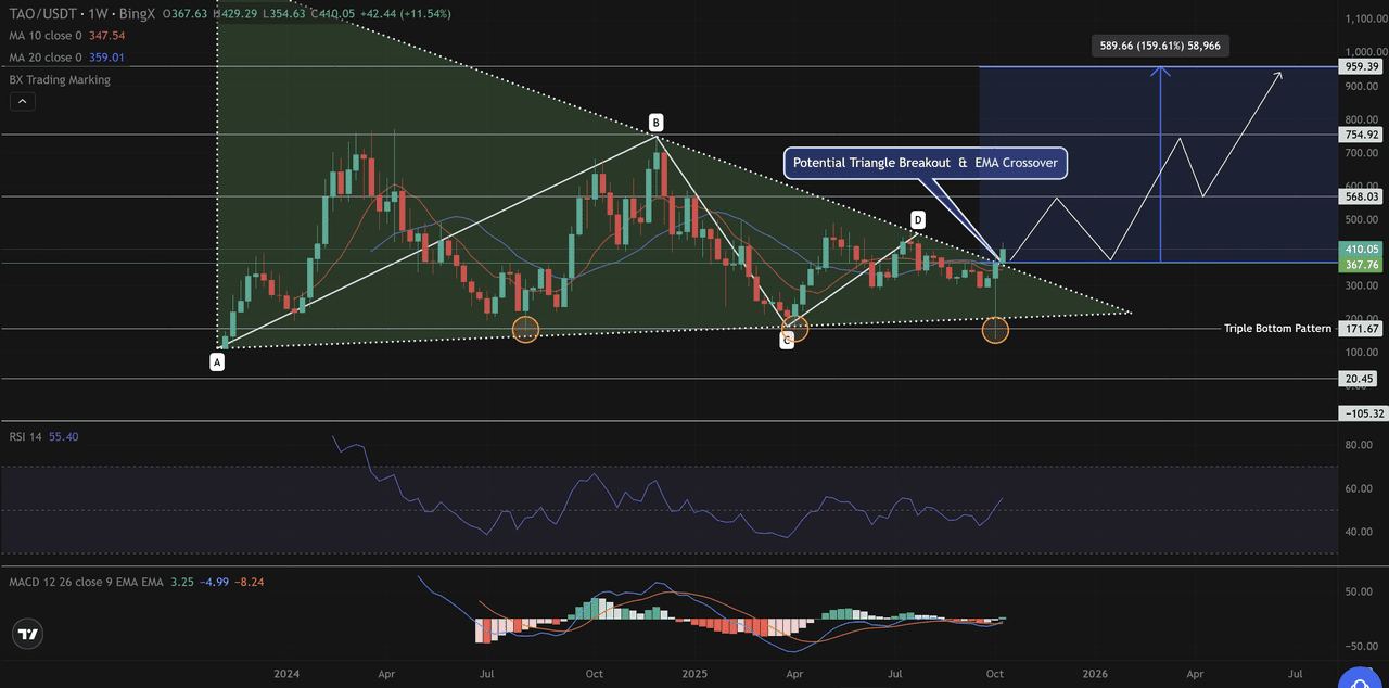 With the price now holding around $410, TAO has also formed a triple bottom pattern near $171, signaling a strong base of long-term support.