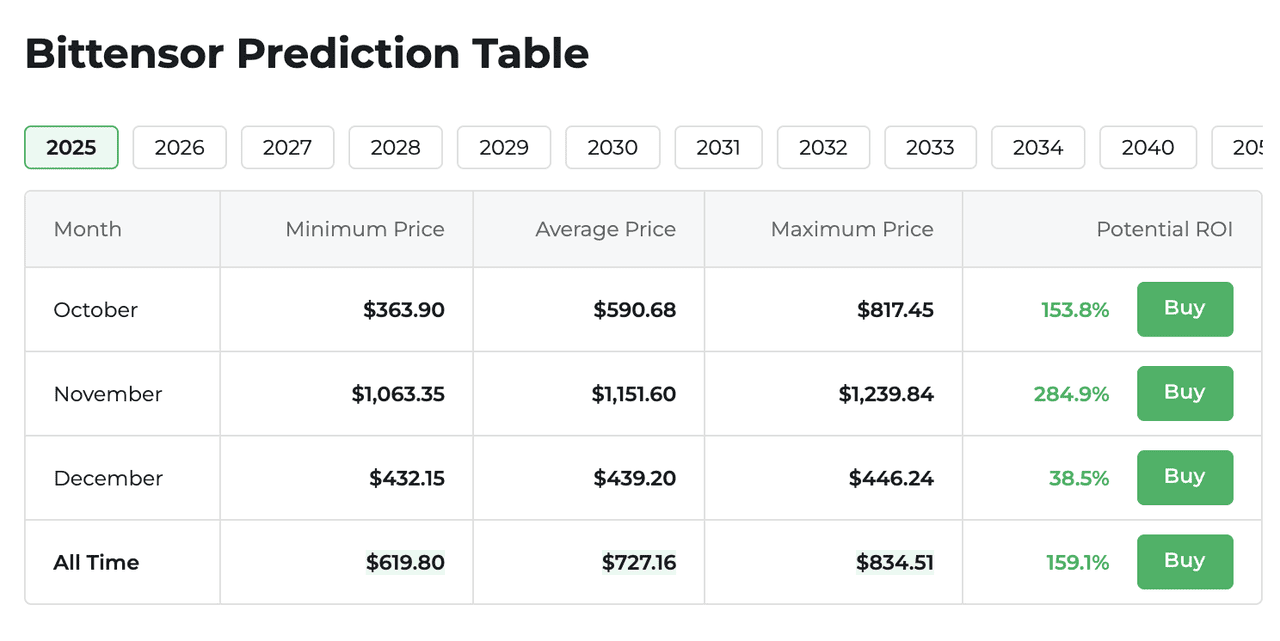 As of October 12th, Bittensor's TAO token has shown bullish momentum following a recent 16% surge due to institutional inflows, trading around $413 with analysts forecasting varied trajectories for the remainder of the year and into 2025.