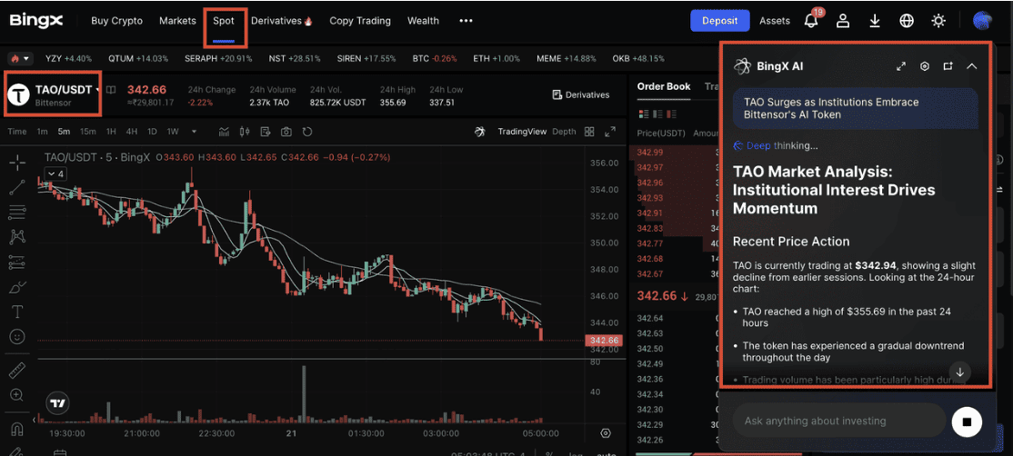 TAO/USDT trading pair on the spot market powered by BingX AI insights