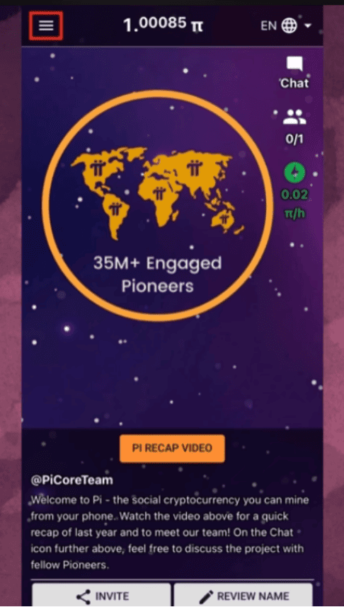 Step 2: Open the Pi Network mining app and click on the side menu, represented by the ☰ icon.