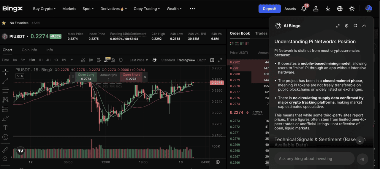 4. Use BingX AI by clicking the AI icon on the chart; it automatically displays real-time sentiment, volatility ranges, and support/resistance levels for PI.