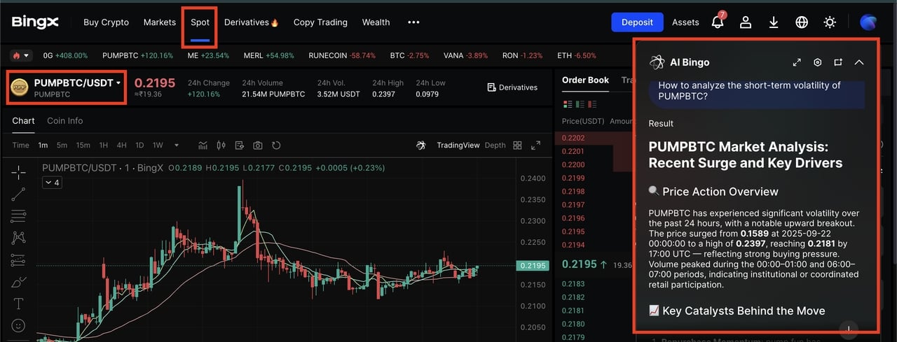 PUMPBTC/USDT trading pair on the spot market, powered by AI Bingo trading assistant