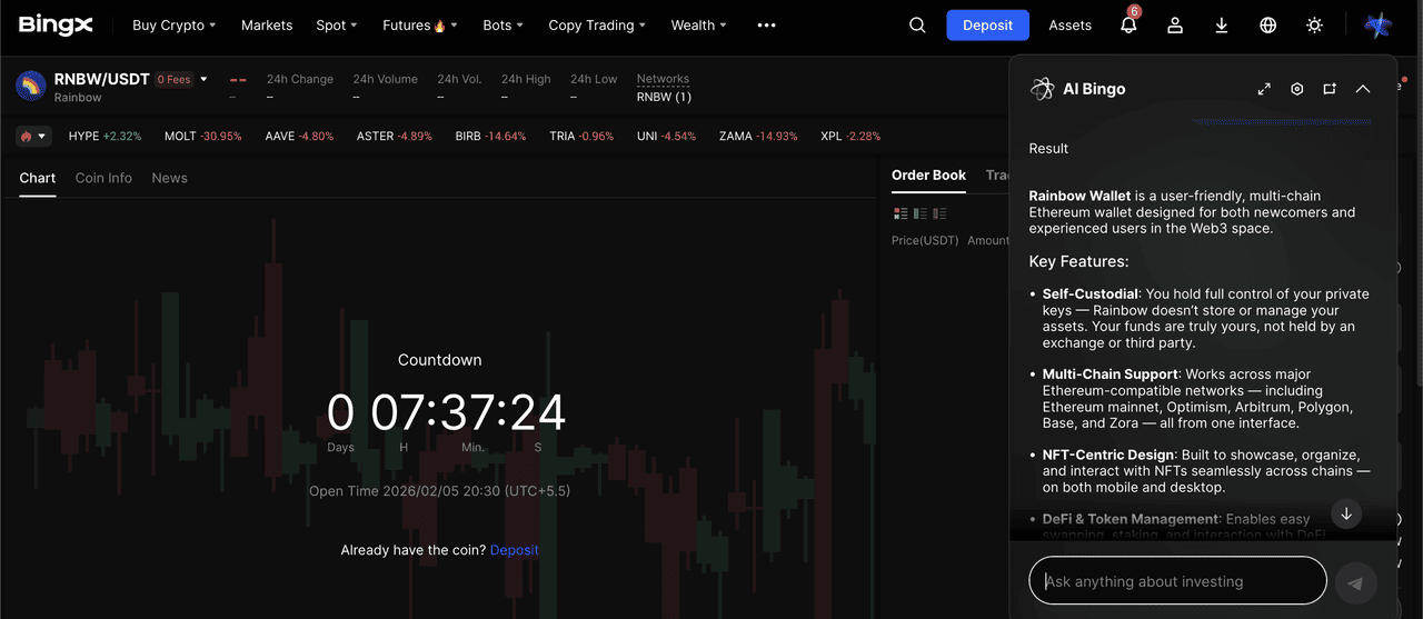 Following the launch on February 5, 2026, $RNBW is available for trading on BingX. Harnessing the power of BingX AI, you can navigate the RNBW/USDT spot market with institutional-grade precision, utilizing real-time sentiment analysis and automated risk management to optimize your airdrop strategy.