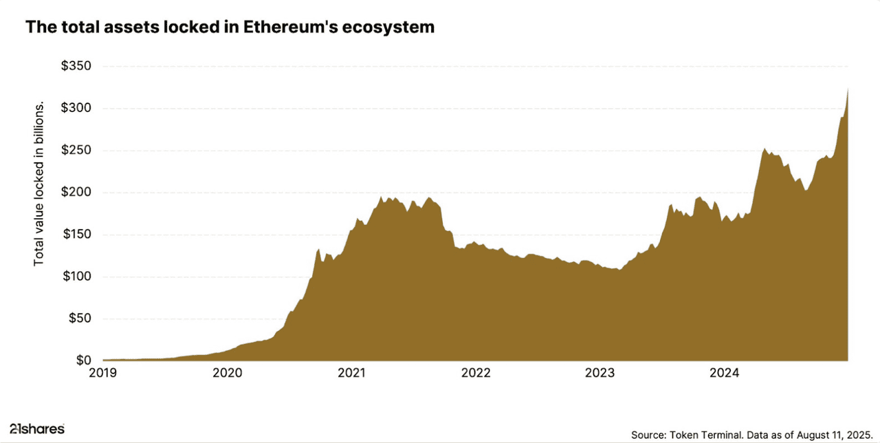 Why is Ethereum at the center of both Rainbow's strategies? The answer is simple: Ethereum is the backbone of Web3. According to 21Shares, Ethereum's total value locked (TVL), which measures the dollar value of all crypto assets held in smart contracts on its network, reached an all-time high of $312.6 billion in August. This growth is being driven by the rising adoption of decentralized finance (DeFi) apps, where users can lend, borrow, trade, and earn interest directly on-chain without relying on banks.