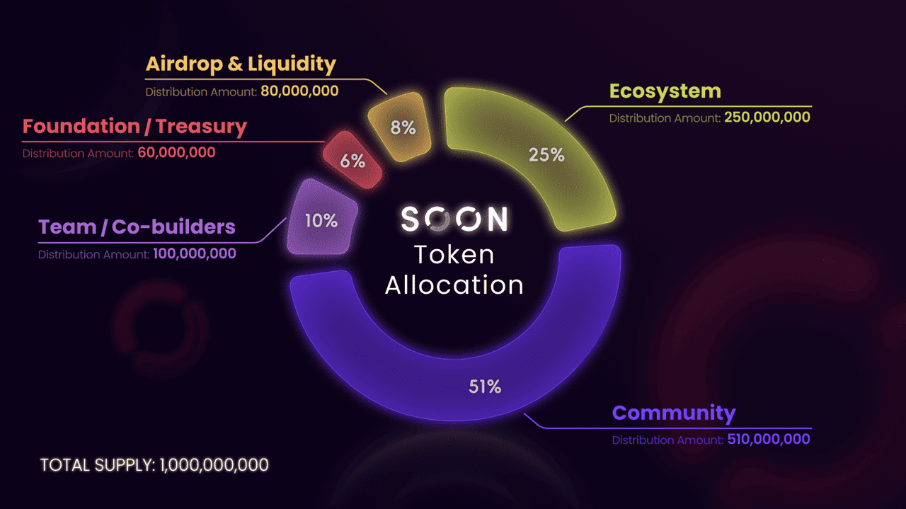 • Community (51%): 510 million $SOON is allocated to fair launch events and distributed to long-term supporters of the SOON ecosystem.