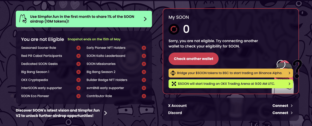Step 2: Check Your Eligibility The claim site will show your allocation if you participated in earlier SOON activities, held NFTs, or contributed through campaigns like simpfor.fun.