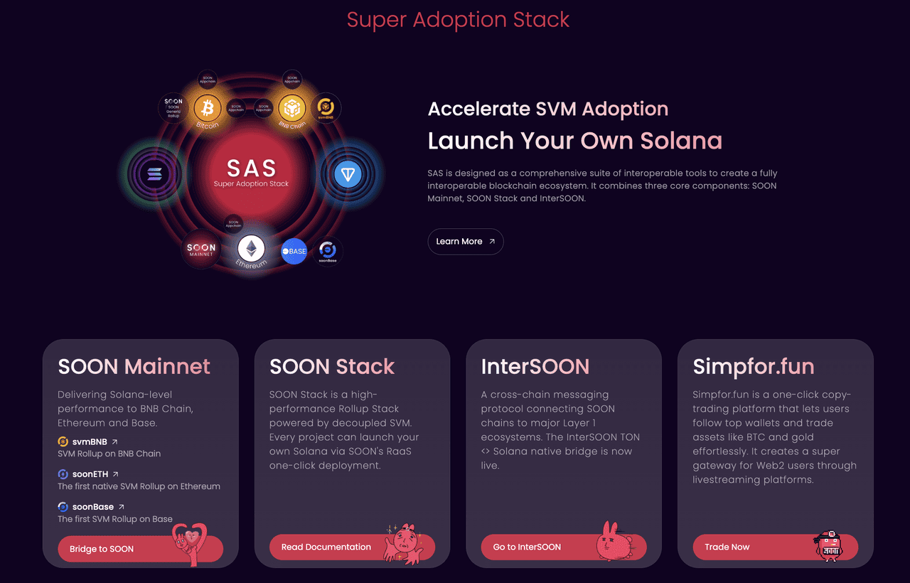 SOON operates through a modular system called the Super Adoption Stack, designed to bring Solana-level speed and scalability to other blockchain ecosystems. At its core is the Decoupled SVM, which retains Solana’s performance benefits while being portable across networks.