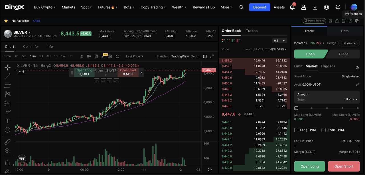Spot trading is ideal if you want simple buy-and-hold or swing-trading exposure to traditional assets without leverage. On BingX, this includes tokenized stocks (xStocks) and tokenized precious metals such as gold and silver, which track real-world prices while settling in USDT.