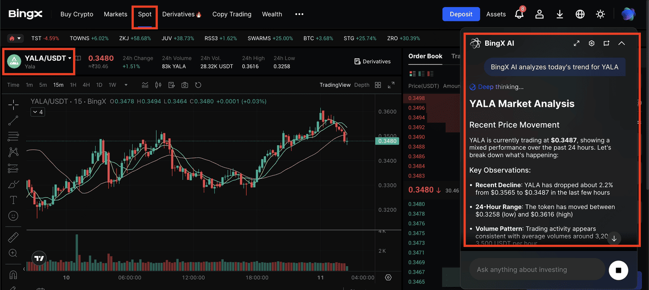 BingX AI to monitor real-time market trends, sentiment analysis, and price forecasts for YALA. BingX AI can help you identify entry and exit points, track trading volume spikes, and assess volatility, giving you data-driven insights to make informed moves in the fast-paced DeFi market.