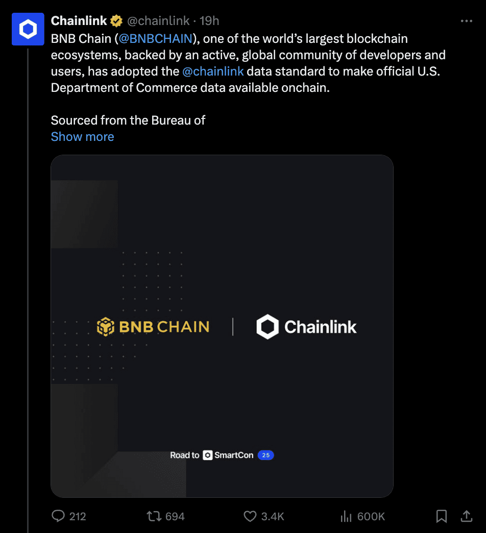 Chainlink integra el Protocolo de Interoperabilidad Cross-Chain (CCIP) y los Flujos de Datos (Data Streams), dando a los desarrolladores acceso a comunicación cross-chain segura y datos fiables del mundo real. En conjunto, estos avances destacan cómo el crecimiento del ecosistema y la innovación en infraestructura están trabajando en tándem para fortalecer la utilidad, la actividad de la red y el valor a largo plazo de BNB.