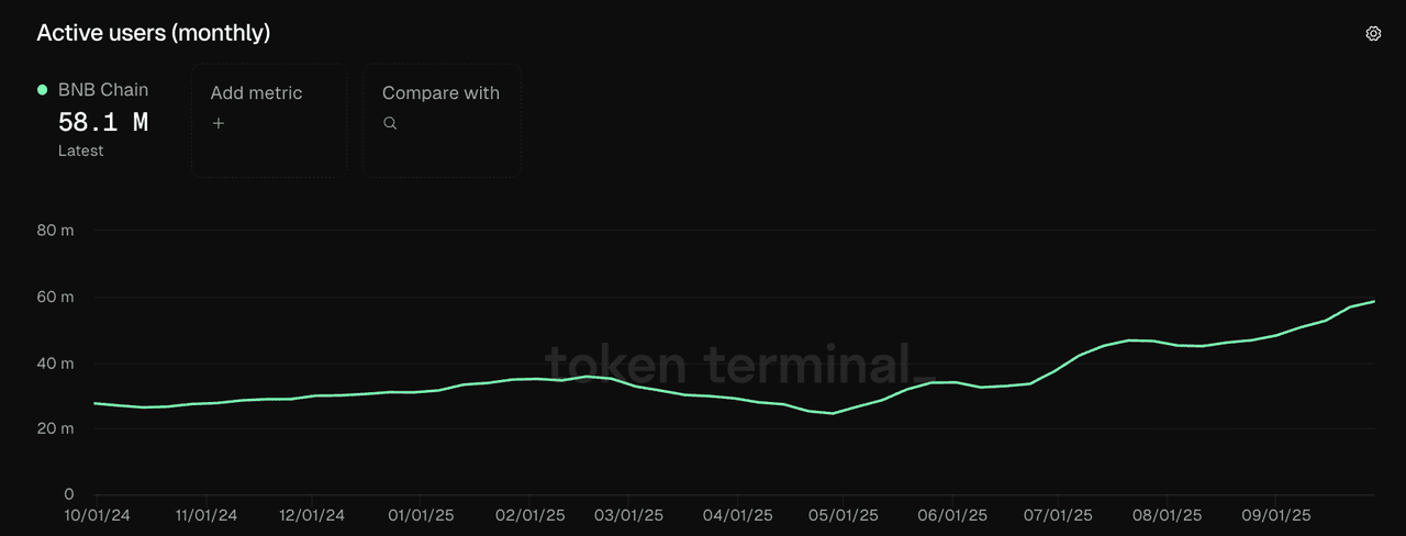 Los usuarios activos mensuales en BNB Chain aumentaron un 61% desde enero de 2025 | Fuente: Token Terminal