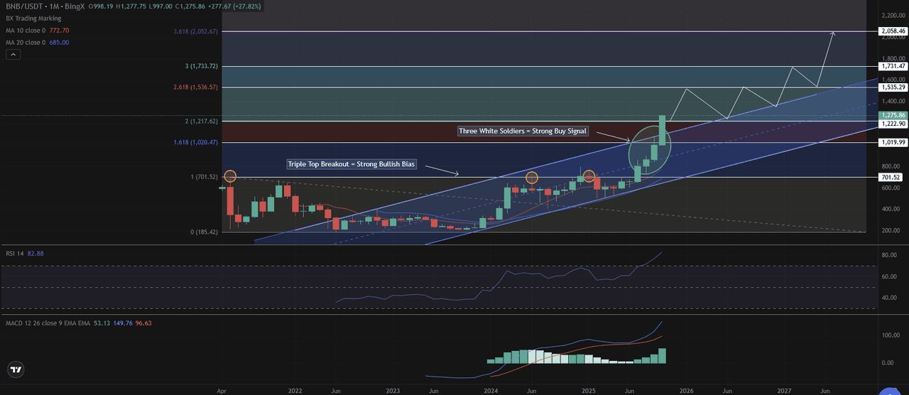 En el frente técnico, el gráfico mensual de BNB muestra una clara continuación de su tendencia alcista a largo plazo, moviéndose con confianza dentro de un canal ascendente definido por máximos y mínimos crecientes. La ruptura por encima del techo de triple máximo de $700 a principios de este año confirmó un cambio decisivo en la estructura del mercado, marcando el inicio de una fase alcista más fuerte.