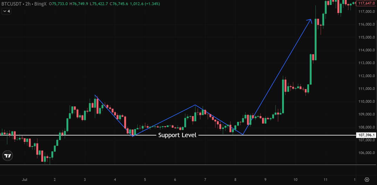 Como se ve en el gráfico adjunto de BTC/USDT, el precio estableció un suelo de soporte claro en aproximadamente $107,396. Nota cómo el precio cayó múltiples veces hacia esta línea horizontal blanca (el "Nivel de soporte") pero falló en romperla.