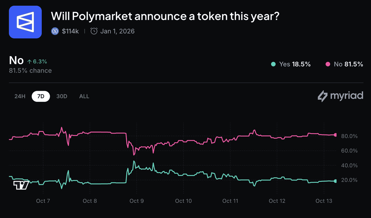 La communauté crypto spécule déjà sur la date à laquelle Polymarket annoncera officiellement son jeton. Sur Myriad, une plateforme de prédiction décentralisée concurrente, un marché populaire intitulé « Polymarket annoncera-t-il un jeton cette année ? » a attiré plus de 114 000 $ de paris. En octobre 2025, les cotes sont les suivantes :