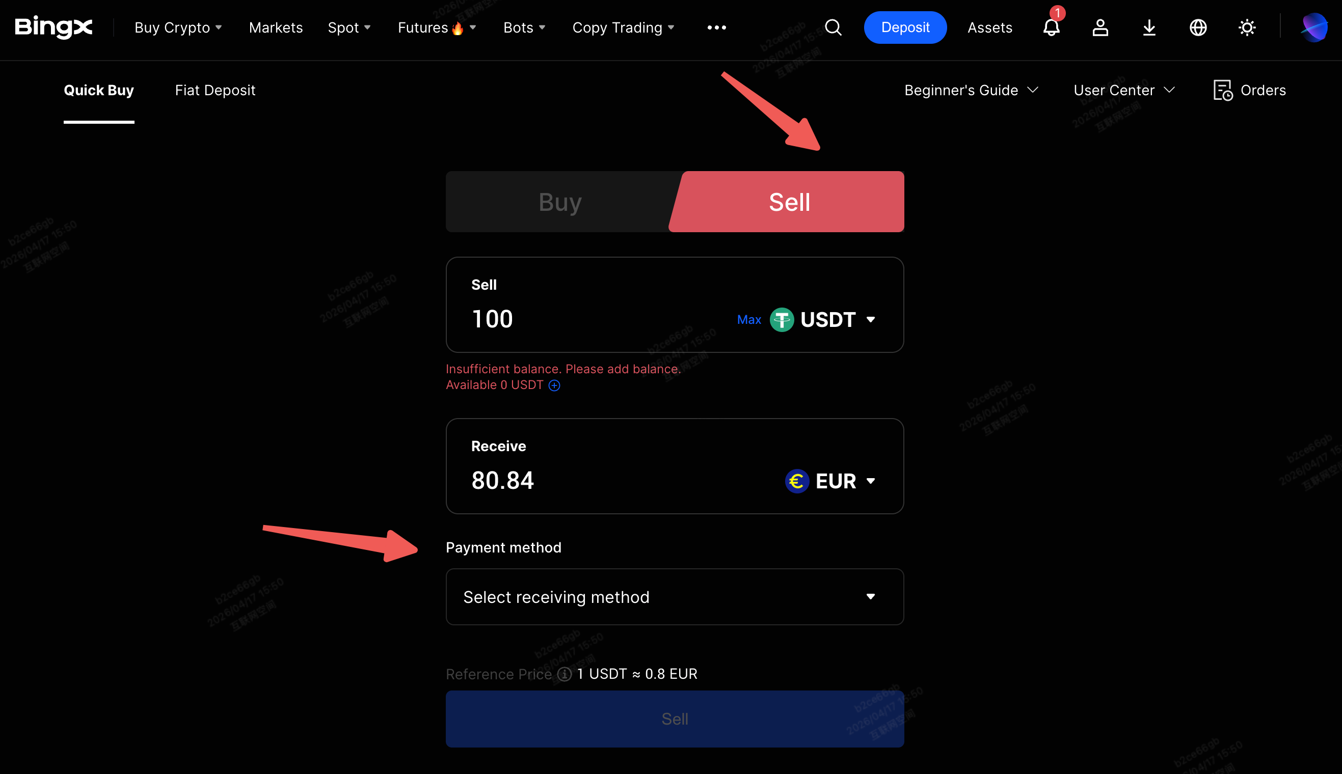 1. Rendez-vous sur ce lien. Sous Achat rapide, sélectionnez Vendre. Dans le menu déroulant, choisissez la cryptomonnaie que vous voulez vendre et la devise fiduciaire que vous souhaitez recevoir.