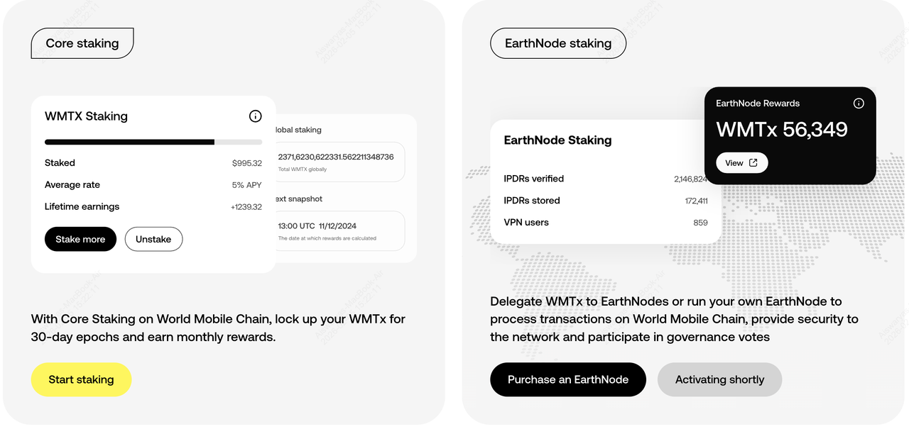 • Imbalan Staking: Pemegang dapat mendelegasikan WMTX ke EarthNodes untuk mengamankan jaringan dan mendapatkan bagian dari biaya transaksi dan inflasi protokol.