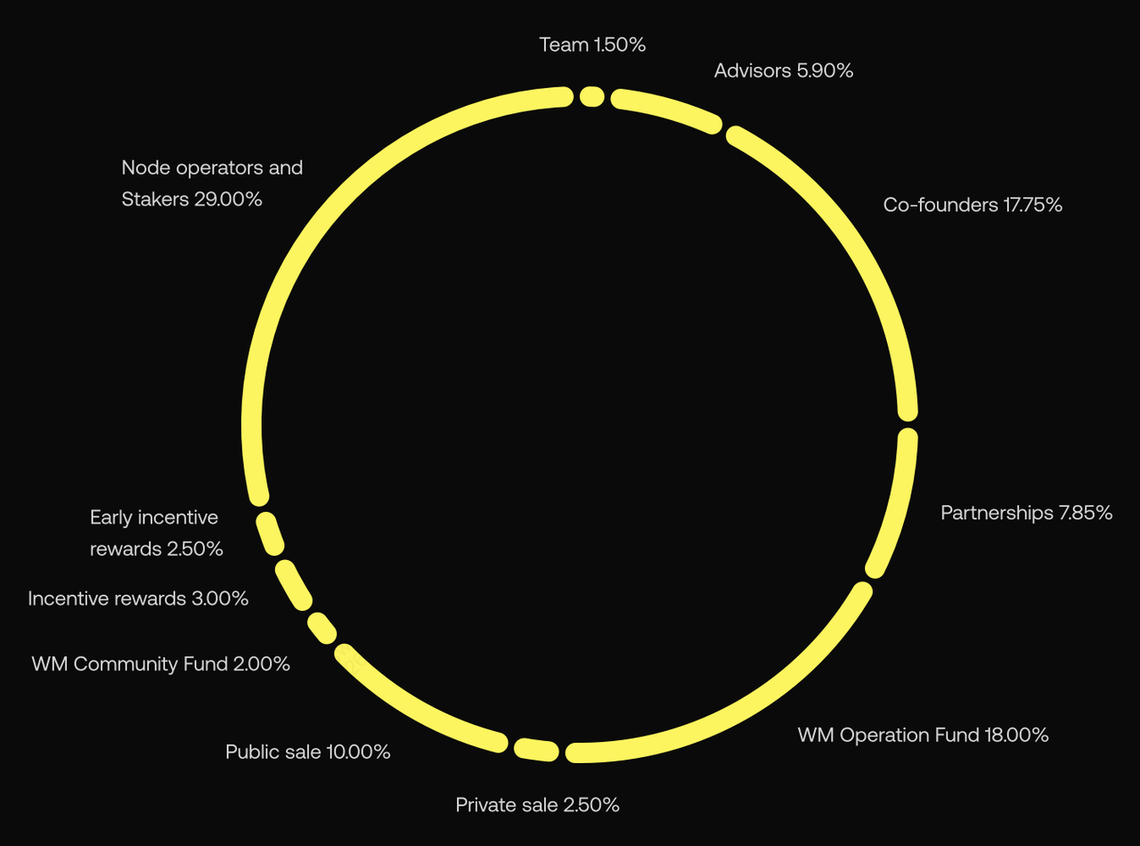 • Penjualan Privat (2,50%): Modal tahap awal yang dihimpun untuk pengembangan proyek, tunduk pada jadwal vesting.