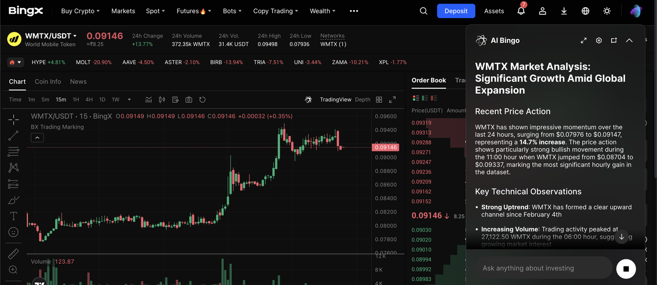 2. Temukan Pasangan: Navigasikan ke tab Spot dan cari WMTX/USDT. Gunakan chart yang didukung BingX AI untuk mengidentifikasi level support.