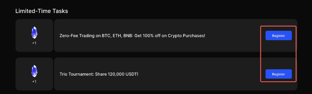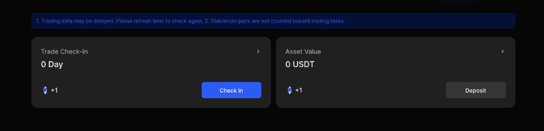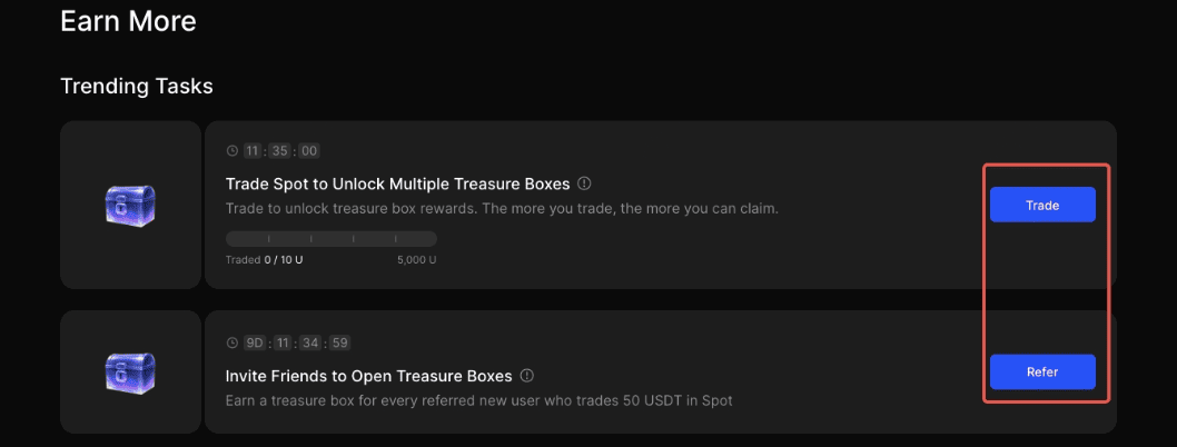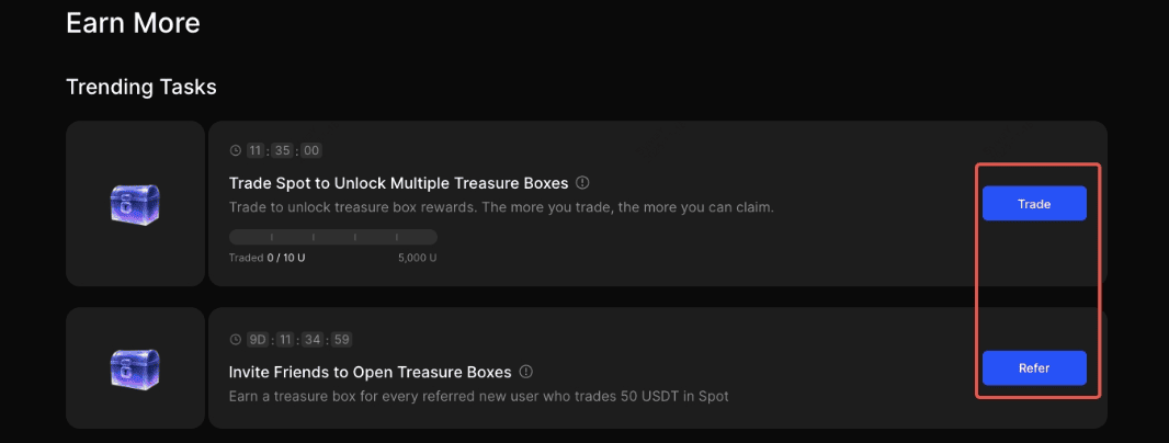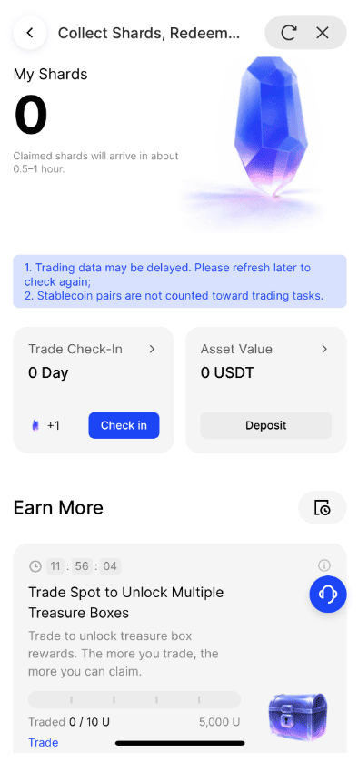 シャードを集めて独占報酬を解除するには、KYC認証の完了、入金、現物ペアの取引(注:ステーブルコインペアは除外)、イベントへの参加、友人の招待などのプラットフォーム内タスクに従うだけです。取引データに短い遅延が発生する可能性があることに注意してください。進捗がすぐに更新されない場合は、後でページを更新してください。