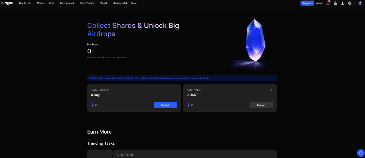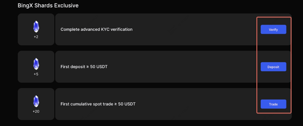 ユーザーは、BingXプラットフォームでの日常的なアクティビティに参加することで簡単にシャードを蓄積できます。これには、KYC認証の完了、入金、取引量に基づく報酬付きの現物取引の実行、キャンペーンやイベントへの参加、招待リンクを通じた新規ユーザーの招待、デイリーログイン、ソーシャルタスク、または進行中のプロモーションで特集されているその他のエンゲージメントアクティビティの完了が含まれます。シャードは資格のある行動が完了すると自動的に付与され、ユーザーはBingXアカウントダッシュボードから直接残高と進捗を便利に追跡できます。