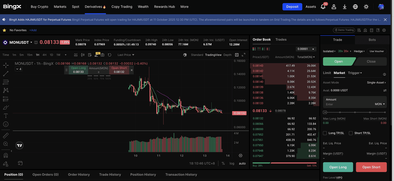 公式の現物上場に先立ち、トレーダーはBingX無期限先物市場を通じてMONに早期にアクセスできます。MON/USDT無期限契約では、トークン自体を保有することなく、MONの価格に対してロングまたはショートを行うことができます。