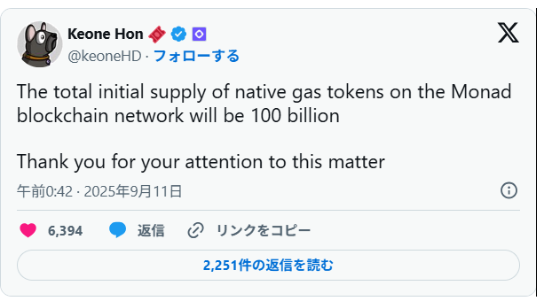Monadの共同創設者兼ゼネラルマネージャーであるKeone Hon氏のXへの投稿によると、Monadの総供給量は100,000,000,000 MONです。チームはまだ完全なトークノミクスの内訳を公開しておらず、2025年後半のメインネットローンチに近づくにつれて発表される予定です。エアドロップ請求ポータルは、MONのトークン配布プロセスの開始を告げる2025年10月14日に先行して開設されます。