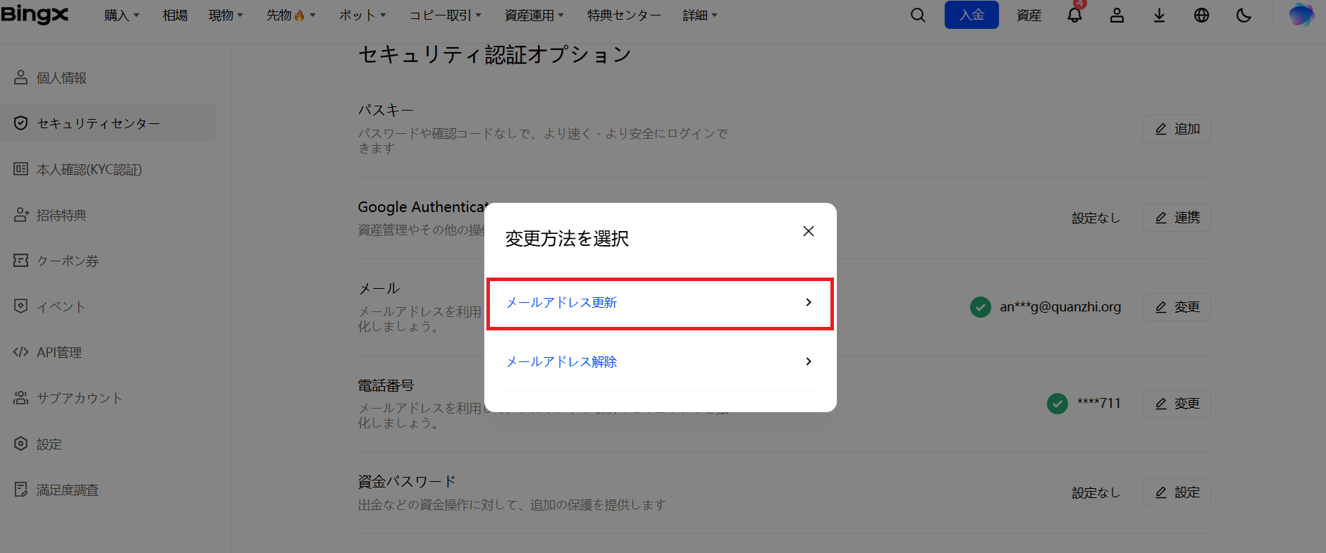 BingX公式サイトやアプリで、以下の手順に沿ってメールアドレス認証の連携、更新、連携解除などを行うことができます。