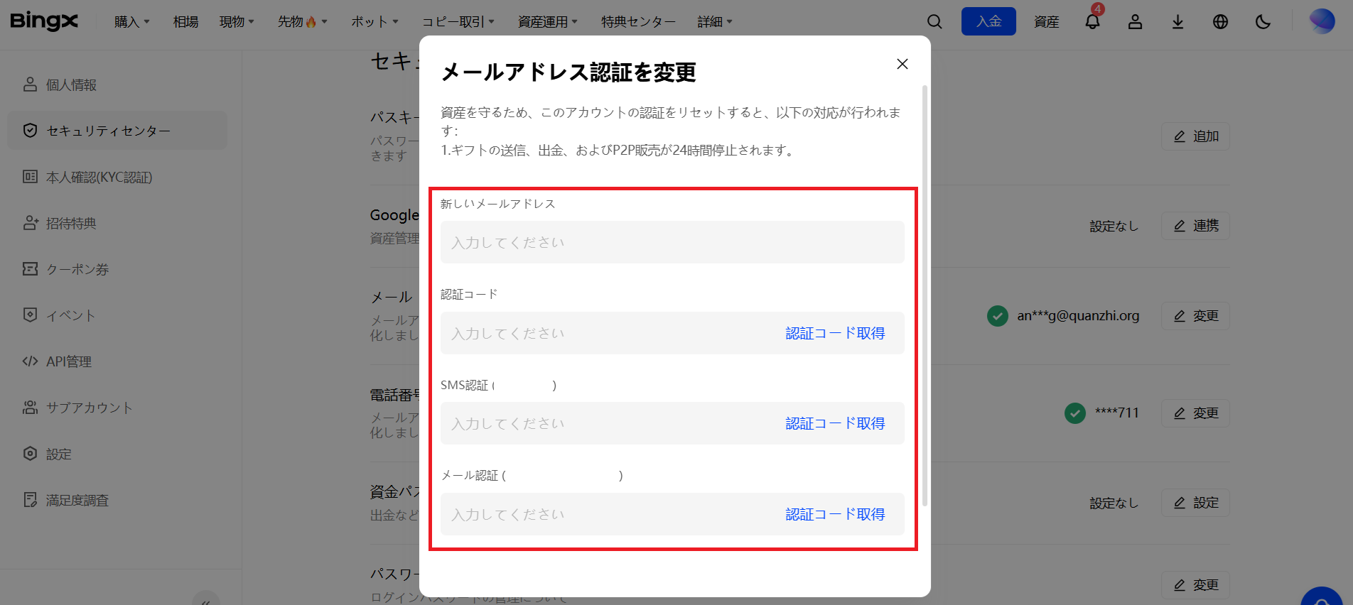 2) 安全性項目を削除または変更した後、再度BingXアカウントにログインする必要があります。