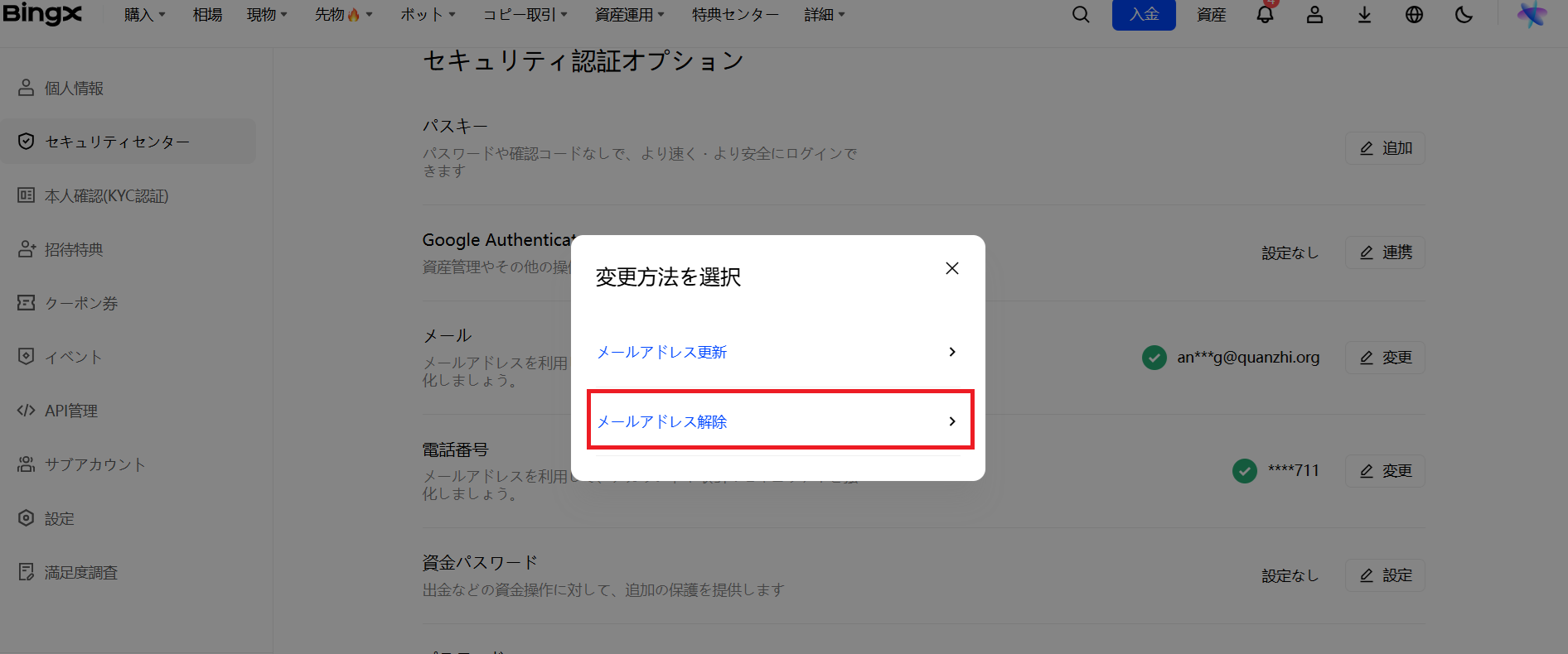 ステップ1:BingXにログインします。右上のアバターアイコンをクリックすると、ドロップダウンメニューが表示されます。「セキュリティ」を選択します。「セキュリティセンター」セクションまでスクロールし、メールの右側にある「変更」ボタンをクリックし、「メールアドレス解除」を選択します。