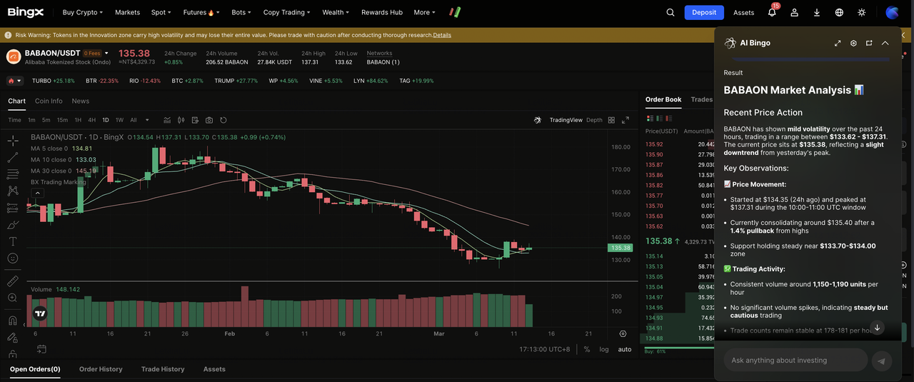 - Use BingX AI para avaliar condições de mercado: Antes de fazer uma ordem, você pode perguntar à BingX AI sobre tendências de preços recentes, níveis técnicos principais ou sentimento de curto prazo relacionado ao BABA e ao setor de tecnologia chinês mais amplo antes do relatório de ganhos de 19 de março.