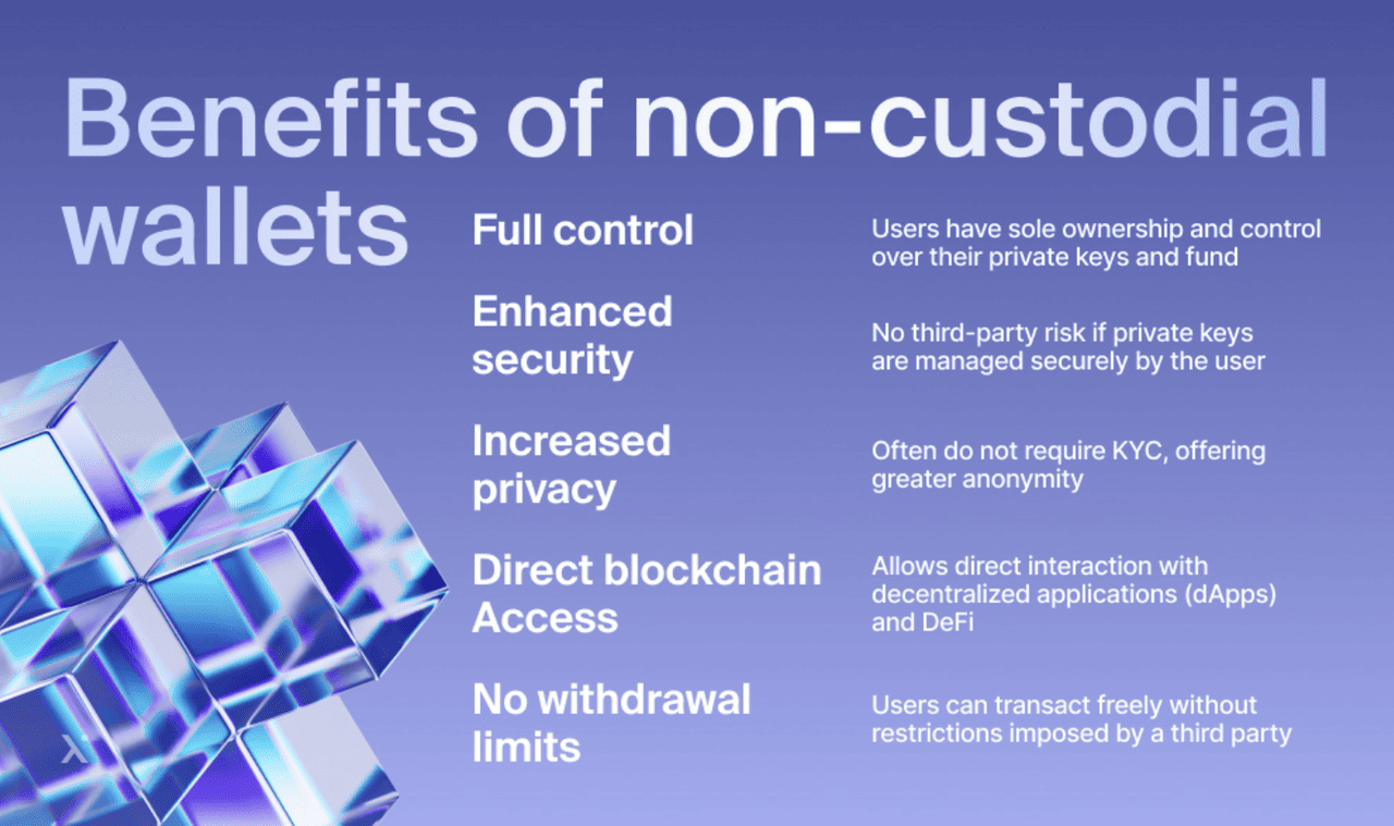 O benefício é controle completo e privacidade. Você é o único proprietário dos seus fundos, e nenhum serviço centralizado pode acessá-los ou congelá-los. Carteiras não custodiais são preferidas por usuários experientes, detentores de longo prazo e aqueles que interagem com plataformas de