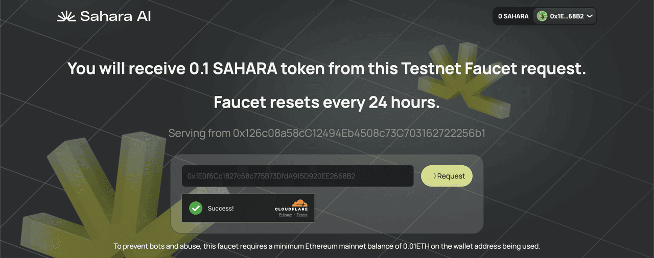 3. Reclame tokens SAHARA grátis no Faucet: Você precisará de tokens SAHARA para registrar ativos e concluir transações. Você pode reclamar 0,1 SAHARA por dia para cobrir as