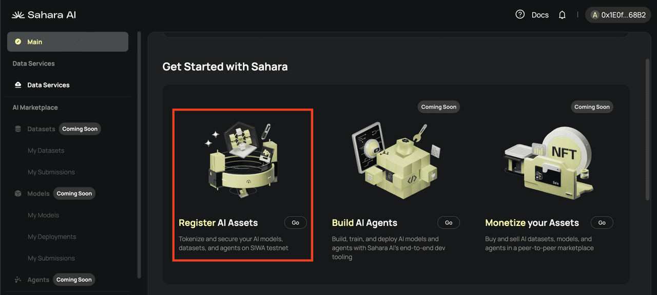 4. Tokenize seus ativos AI: No Portal do Desenvolvedor, vá para Registrar Ativos AI. Faça o upload de um conjunto de dados nos formatos .json, .csv ou .txt. Sahara irá cunhá-los como NFTs ERC-721. Isso prova que você é o proprietário do conjunto de dados e contribui para sua pontuação de atividade.