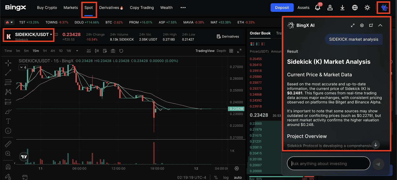 Página de negociação SIDEKICK/USDT no mercado spot, com informações do BingX AI