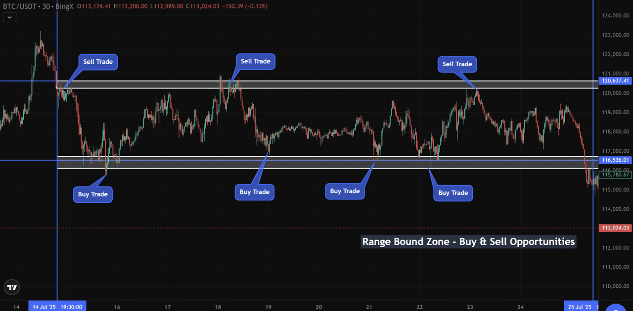 No gráfico BTC/USDT, o suporte em torno de US$ 116.500 e a resistência próxima a US$ 120.600 definiram um claro intervalo de negociação. Cada teste de suporte acionou oportunidades de compra que impulsionaram o preço para cima, enquanto os movimentos em direção à resistência forneceram configurações de venda a descoberto, já que o mercado não conseguiu romper. Os traders que aplicaram esse método conseguiram realizar várias negociações lucrativas durante o que muitos consideram um mercado lateralizado.