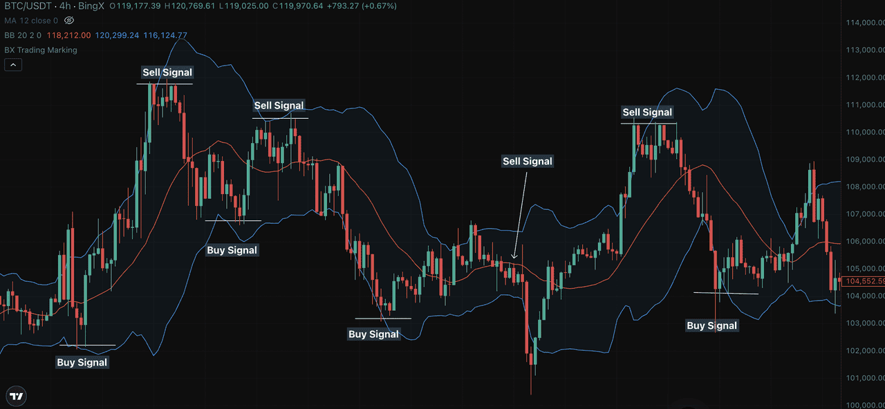 Por exemplo, se o BTC/USDT estiver sendo negociado em uma faixa estreita e o preço tocar a banda inferior, um trader pode procurar uma configuração de compra de curto prazo e fechar a posição quando o preço retornar à banda central. Essa estratégia é mais eficaz em mercados laterais com Bandas de Bollinger planas, mas deve ser evitada em mercados em tendência, onde o preço pode continuar se movendo além das bandas.