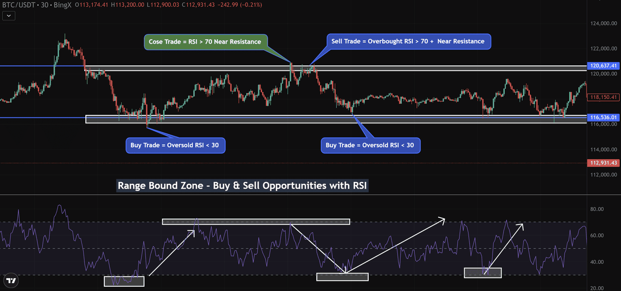 No gráfico BTC/USDT, o RSI caiu abaixo de 30 sempre que o preço testou o suporte próximo a US$ 116.500, sinalizando condições de sobrevenda e aumentando a probabilidade de um repique. Por outro lado, quando o preço se aproximou da resistência em torno de US$ 120.600, o RSI subiu acima de 70, o que destacou os níveis de sobrecompra e sinalizou possíveis oportunidades de venda a descoberto. A combinação desses sinais com os limites do intervalo tornou as entradas mais precisas e reduziu as configurações falsas.
