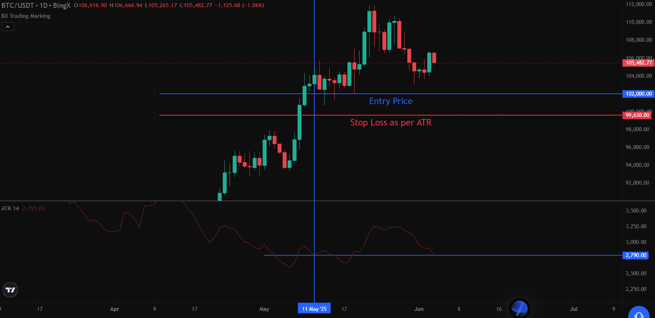 Por exemplo, se o Bitcoin romper acima de US$ 100.000 com um ATR de 14 dias de US$ 2.790, um movimento de 1,5× ATR equivale a cerca de US$ 4.185. Um fechamento forte acima da resistência perto de US$ 105.000 confirma o momentum, enquanto um stop colocado logo abaixo da zona de rompimento (ajustado por ATR) fornece proteção se o movimento falhar.