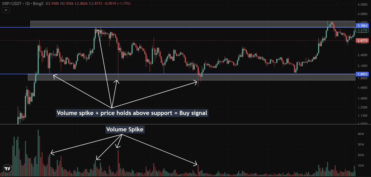 Falsos rompimentos são filtrados verificando o volume. Rompimentos de baixo volume geralmente falham, enquanto movimentos genuínos são apoiados por um momentum forte e de alto volume.